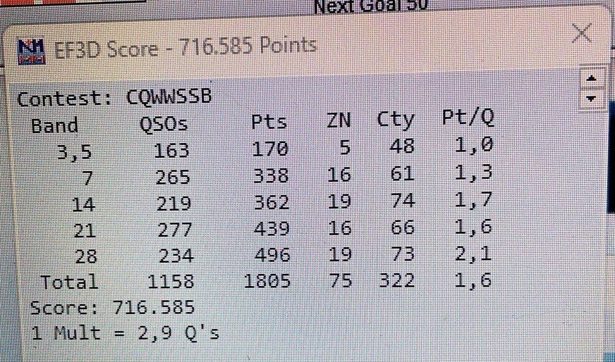 Es van fer un total de 1158 comunicats en el conjunt de bandes, amb estacions de radioaficionats de tot el mon, el que ens va donar un resultat de més de 716000 punts.